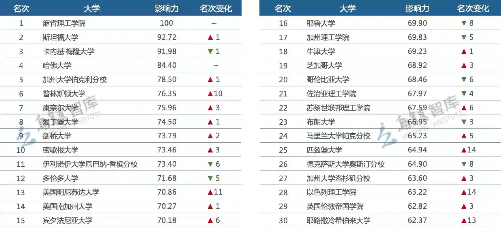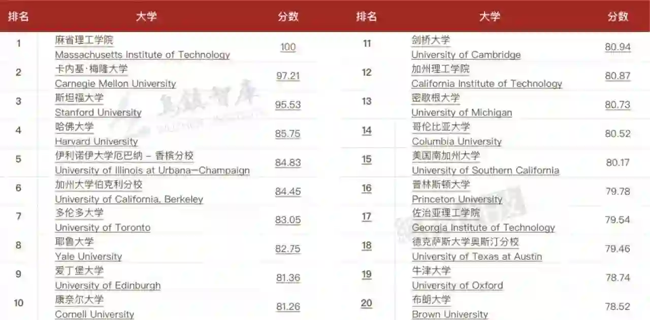 这是乌镇智库对今年全球大学人工智能领域综合能力的排名: