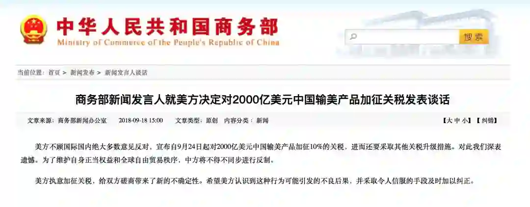 9月18日,商务部新闻发言人就美方决定对2000亿美元中国输美产品加征关税发表谈话,谈话内容如下:
