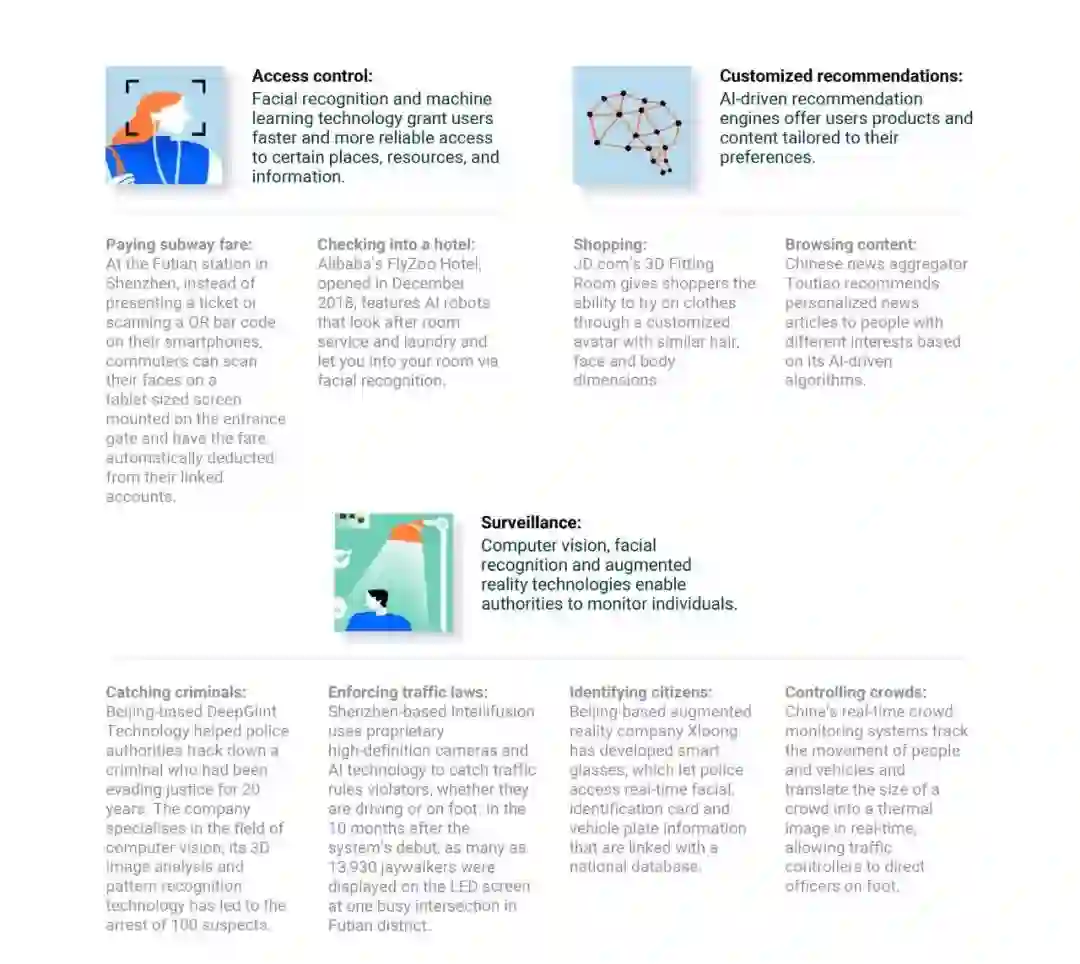 报告发现,人工智能(AI)也在中国大规模使用,其应用范围包括地铁支付票价、面部识别进入酒店、以及在线购物或在线浏览新闻的定制推荐等。此外,人工智能也被广泛用于监控监视,如帮助追踪逃犯或执行交通法。