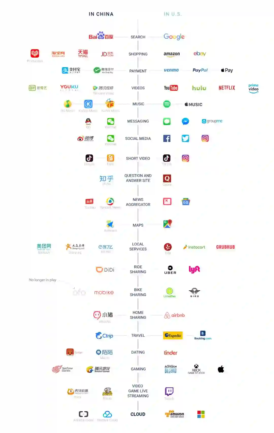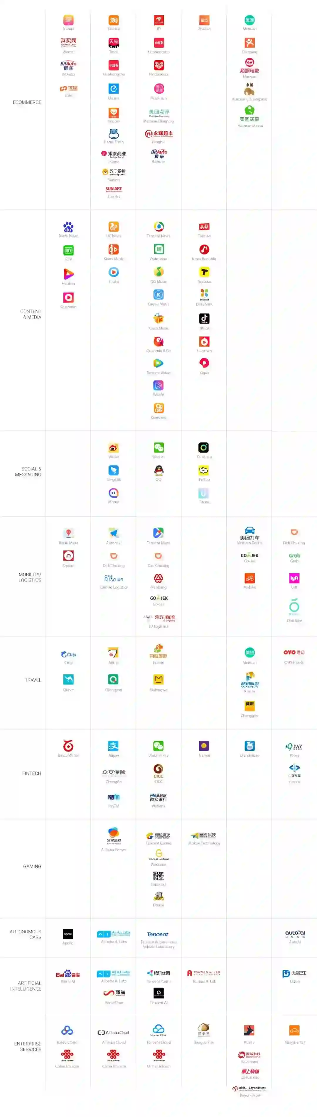 再看各大垂直领域的顶级玩家,中美基本上都有相对标的重量级企业。