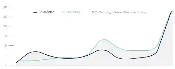 去年对于中国科技 IPO 来说是一个丰收,其中 56 家技术、媒体和电信(TMT)公司上市,总市值达到 2220 亿美元——一半在中国香港,一半在美国——而 2017 年仅有 12 家此类 IPO,2016 年有 11 家。从下面的发展曲线来看,中美两国在这一方面的差距正在越来越小。
