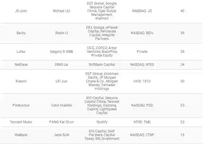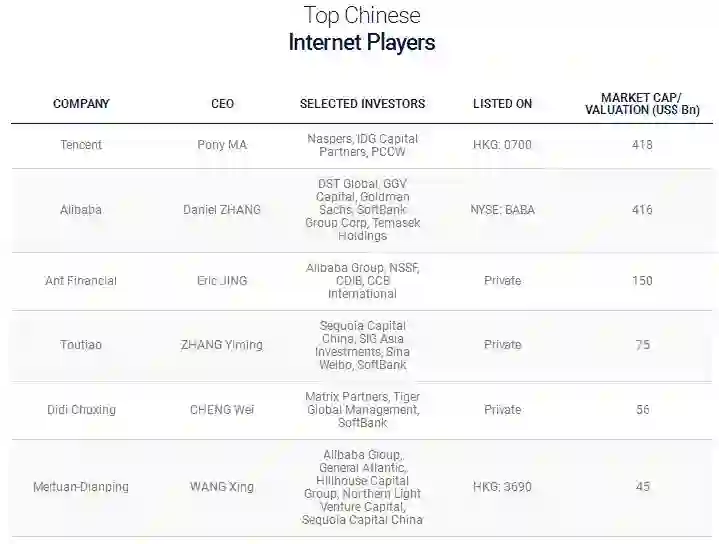 根据报告统计,中国最大的五家互联网企业分别为腾讯、阿里巴巴、蚂蚁金服、今日头条和滴滴出行,估值分别为 4180 亿美元、4160 亿美元、1500 亿美元、750 亿美元和 560 亿美元。