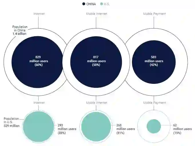 目前美国的互联网普及率高达 89%,而中国的普及率仅为 60%,但是得益于庞大的人口基数,该规模几乎是美国互联网用户数量的三倍。在移动支付领域,这一差距则更大:使用手机支付服务的中国用户(5.83 亿)比美国整个国家的人口都要多。