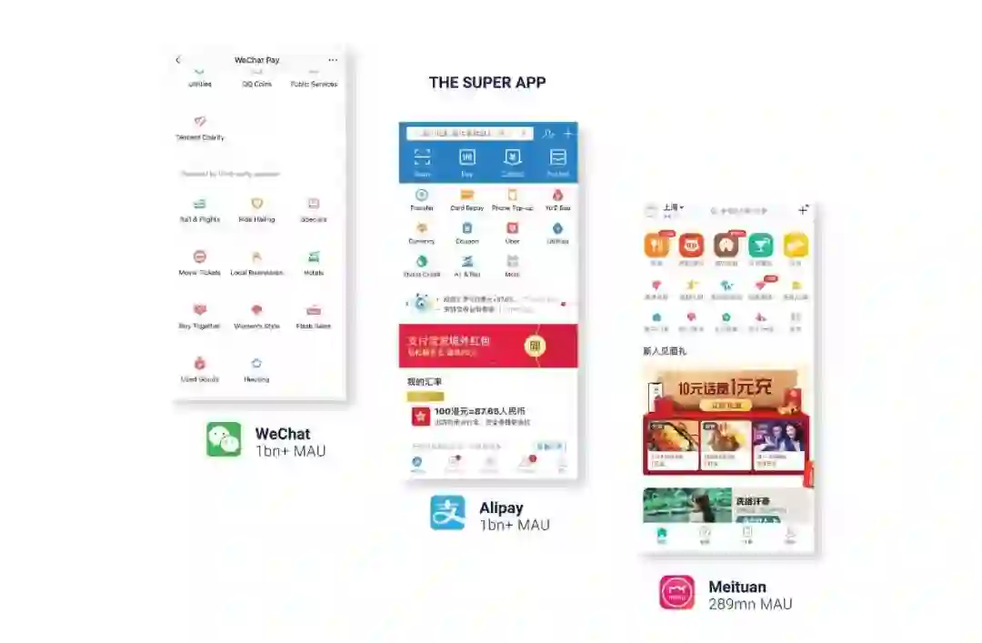 中国开创了超级应用程序的先河,即从购物、乘车到转账、航班预订等一站式服务,无需离开应用程序即可访问,最为典型的应用就是微信、支付宝、美团等。全球科技公司现在都在复制这一概念,从超级应用到社交+电子商务再到短视频等领域无一幸免。