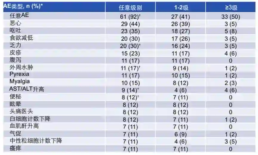 安全性分析:最常见的(≥10%)AE总结见下表,≥3级的AE发生率为50%。最常见的AE为恶心,呕吐,食欲减低,乏力和皮疹。