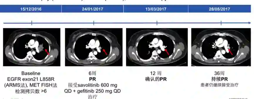 研究者同时汇报了1例接受联合方案取得PR的病例。51岁女性,EGFR突变阳性,接受一线吉非替尼治疗,最佳疗效PR,PFS 3.8个月。2015年11月25日耐药后活检发现EGFR L858R突变(ARMS法),FISH法检测MET拷贝数>10,接受联合方案治疗,最佳疗效PR,目前已服药36周,仍维持PR继续服药。治疗过程中的影像学变化总结如下。