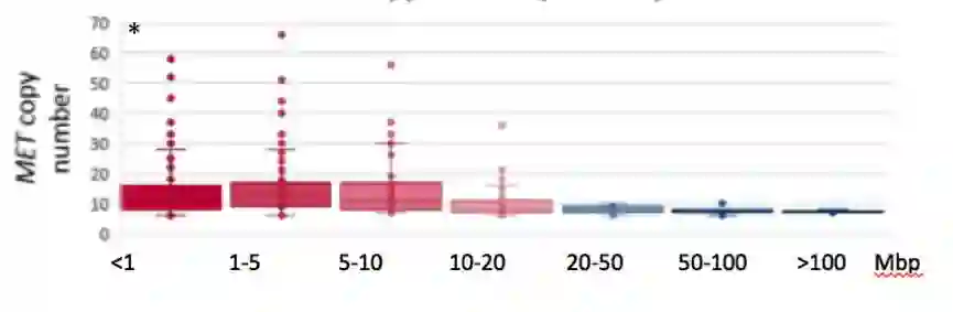 研究采用杂交捕获的CGP检测18200例NSCLC患者,其中MET基因扩增的患者545例(发生率约为3%),其中457例(84%)为簇状扩增(扩增片段<20Mb),扩增片段的中位长度为2Mbp;88例(16%)患者为非簇状扩增,扩增片段的中位长度为46Mbp。