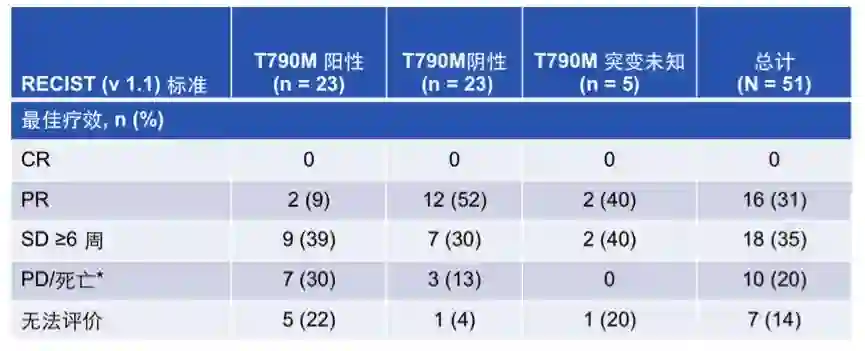 据患者T790M突变状态进行疗效分析, T790M阳性,阴性和突变状态未知的患者,ORR分别为9%,52%和40%,总的ORR为31%。疗效数据总结见下表。