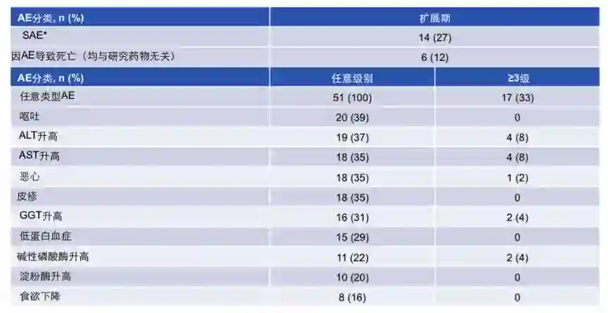 安全性分析:最常见的(发生率≥15%)不良事件(AE)汇总见下表。≥3级的AE发生率为33%;SAE的发生率为27%,最常见的SAE为AST升高(4%,n=2)和肝功能损伤(4%,n=2);因AE导致死亡的患者6例,但均与研究药物无关。