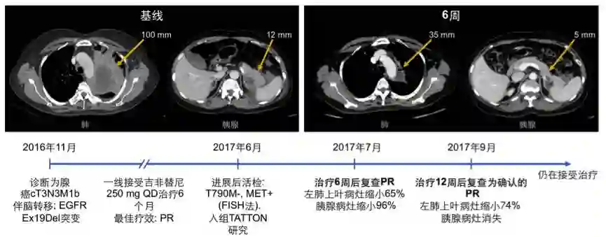 研究者还报道了1例接受联合方案治疗取得PR的病例。57岁女性,非吸烟肺腺癌患者,ECOG PS评分1分。2016年11月诊断为肺腺癌cT3N3M1b伴脑转移; EGFR Ex19Del突变,一线接受吉非替尼250 mg QD治疗6个月,最佳疗效PR。2017年6月,进展后活检T790M-, MET+ (FISH法),入组TATTON研究。2017年7月,治疗6周后复查,疗效评价为PR(左肺上叶病灶缩小65% 胰腺病灶缩小96%);2017年9月,治疗12周后复查,疗效评价为确认的PR(左肺上叶病灶缩小74% 胰腺病灶消失),目前仍在接受治疗。影响学变化和病史总结见下图。
