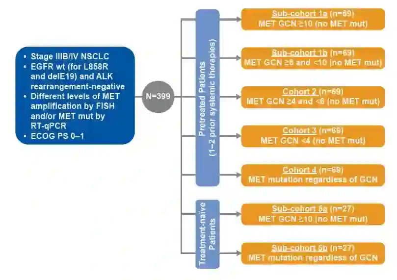 这是一项开放的II期研究,计划入组399例EGFR野生型,ALK阴性,MET基因扩增和/或MET exon14跳跃突变型晚期NSCLC患者。基于患者既往的治疗情况和MET扩增水平和/或突变状态,分别入组至7个不同的队列/亚队列。在(亚)队列1-4中,要求患者既往接受过1-2线系统性治疗;而队列5为初治患者。研究设计如下。