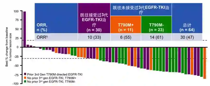在所有入组的MET阳性患者中(N=64),既往接受过三代EGFR TKI治疗的患者,接受联合方案治疗的ORR为33%;既往未接受过三代EGFR TKI治疗的T790M突变患者,ORR为55%;T790M野生型的患者,ORR为61%;总体人群的ORR为47%,总体如下。