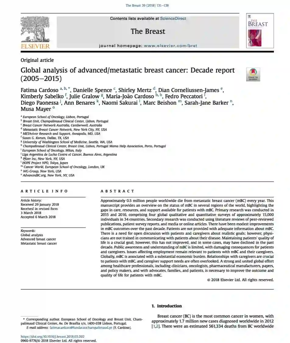 在欧洲肿瘤学院和辉瑞肿瘤学院的共同努力下,包括葡萄牙、美国、澳大利亚、意大利、日本、阿根廷、英国等多个国家的肿瘤专家参与,由葡萄牙的Cardoso教授执笔,近期在Breast杂志发表了2005年至2015年的10年调查报告,阐述了世界范围内转移性乳腺癌的现状,以及不同地区间治疗、可用资源与支持力度的差异,强调了可转移性乳腺癌的治疗进步及尚未满足的临床需求。