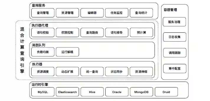 混合计算层主要分为两部分,一部分为执行器代理,主要对查询服务提供 SDK,帮助外部服务理解 SQL,并进行初步校验。另一部分为执行器,主要针对用户大批量的查询进行资源调度,统一解析,和状态同步等。两部分由中间消息队列作衔接,达成负载均衡和双向解耦。