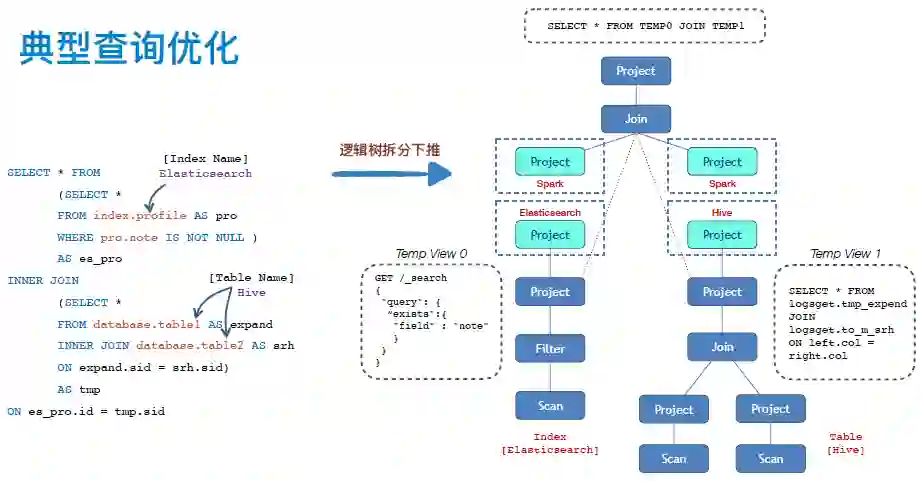 以上图中混查场景为例,语句包含两张同库 Hive 表,一份 Elasticsearch 的 index。