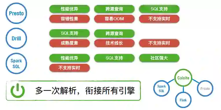 对于统一查询的场景,我们参考了业界已有的引擎,调研发现:受限于当下计算体系结构,每一种引擎都存在优劣势。面临选择的场景,我们考虑使用动态调度的思想,使用 Apache Calcite 作为上层解析器,通过多一次解析搞清楚用户的查询意图,再向对应引擎解释路由,让合适的引擎做合适的事儿。