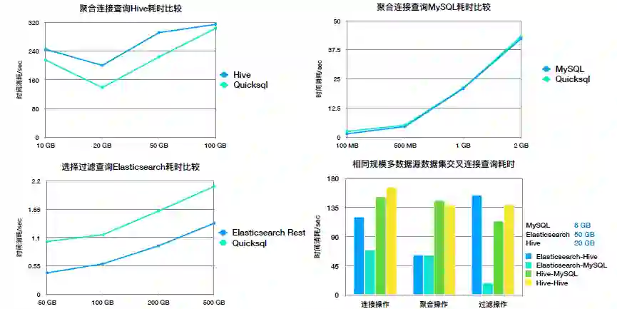 最后一张图展示了在混查场景下的性能比较,可以看到在处理 MySQL 和 Elasticsearch 的关联查询时,由于数据源自身具备索引,QuickSQL 能够充分利用数据源本身的能力实现下推执行,性能会远远优于 Hive 数据源与其他数据源在同等规模数据下关联的性能。