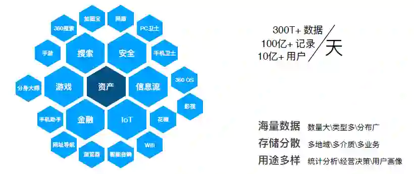 从图中可以看到,公司内业务方向主要分为搜索、安全、视频信息流、游戏、金融和 IoT 六个领域,以这些领域为核心由向外衍生出诸多产品,这些产品每日新增打点数据 300T+,换算后有接近 100 亿 + 条记录,覆盖用户数达到 10 亿 +。由于业务对数据的使用场景在时延和量级上有不同的需求,所以数据往往分散存储在诸多存储介质上,在进行数据产出时需要抽取合并不同介质的数据,以公司内部场景为例。