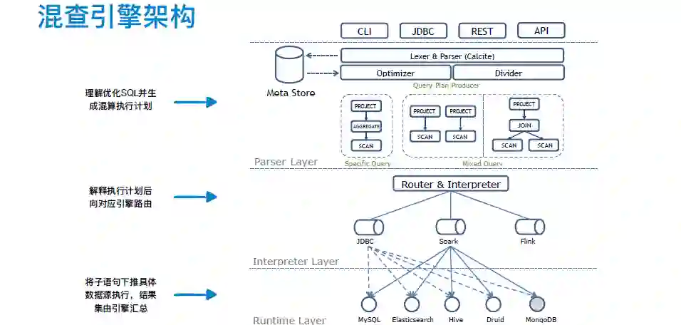 解析层主要通过与元数据库交互进行语句解析和校验,结合独立的权限系统,可以在校验时进行表和字段级别的权限判断。解析生成的逻辑计划会经历联邦查询优化和逻辑树切分。切分后的逻辑子树由解释层进行方言解释和语句路由。对于特定源的查询直接由 JDBC 完成,混查场景则借助 Spark 或 Flink 作为分布式计算中间引擎进行数据周转处理。运行时层提供了下推语句的预聚合及抽取计算。