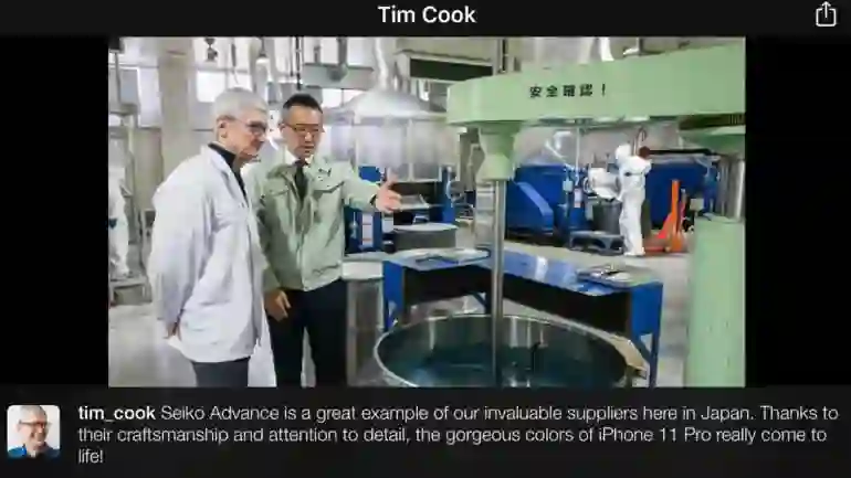 为苹果提供机身颜色的是一家名为精工油墨 (Seiko Advance)的日本公司,能够发布暗夜绿配色的iPhone 11 Pro,它的功劳不可忽视。2019年底库克做了一次亚洲之行,他专程拜访了这家名不经传的油墨公司,称赞了其在质量与工艺上的高度重视。