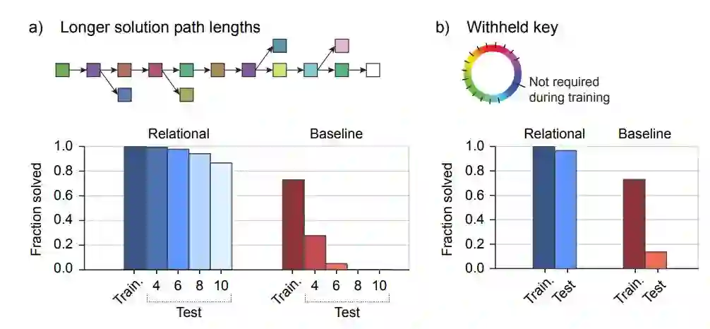 图 5:「方块世界」中的泛化。零样本迁移到需要的水平:(a)打开较长的盒子序列;(b)使用训练期间没用过的锁-钥组合。