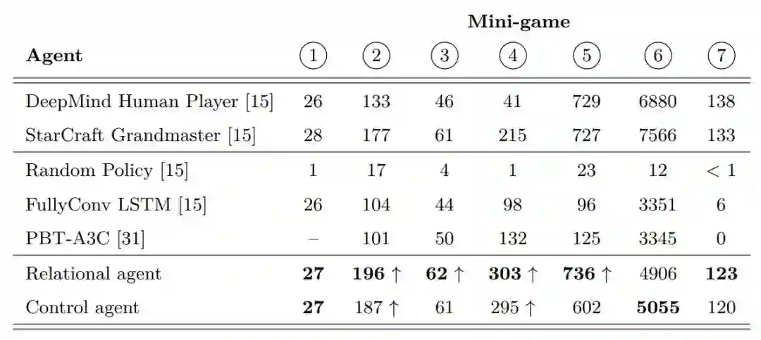 表 1:「星际争霸 II」迷你型游戏中使用全动作组的平均得分。「↑」表示高于大师级人类玩家的分数。小游戏:(1)移动到信标位置;(2)收集晶矿碎片;( 3 ) 发现并打败小狗;(4)打败蟑螂;(5)打败小狗和毒爆虫;(6)收集晶矿和气矿;(7)制造机枪兵。