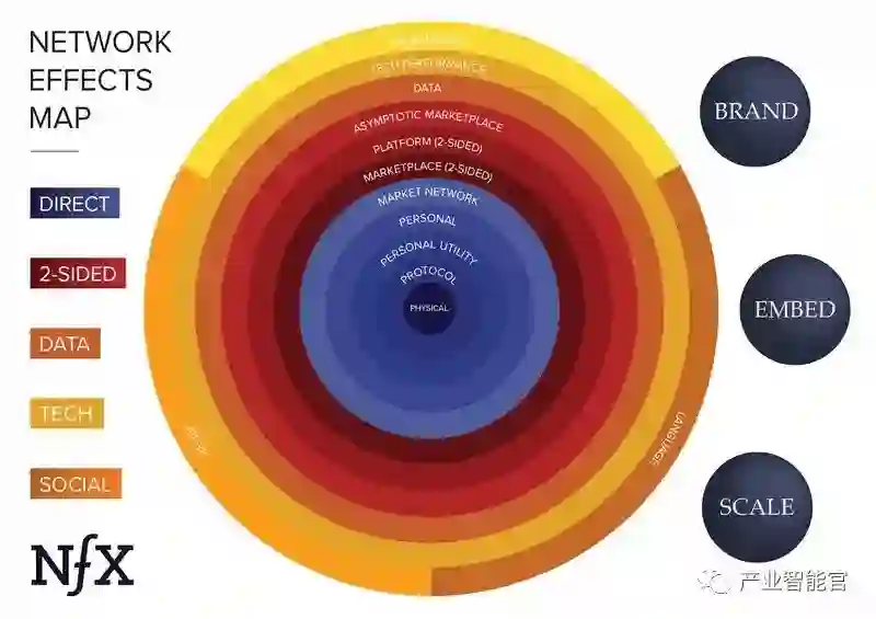 在下面这幅地图中,我们描绘了各种网络效应类型(标签色)和分类(按颜色组织),其中最强也是最简单的网络效应居中。另外三种防御性也列到了图右。