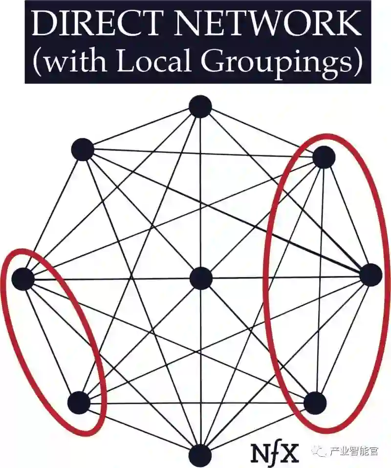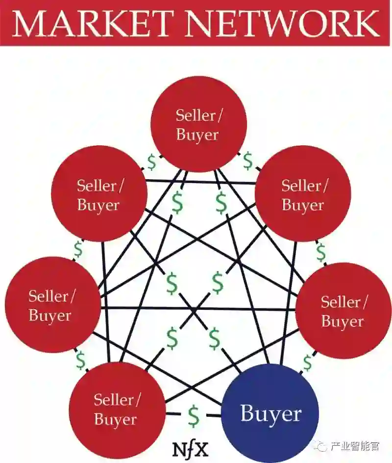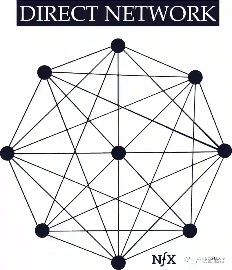 市场网络结合了个人网络的身份与沟通,再加上对交易和目的的关注,这是市场的典型特征。通常,市场网络从增强本已在线下存在的职业网络起步。我们认为市场网络属于直接网络效应的一种形式,因为节点之间的关系是直接的,就像下图一样: