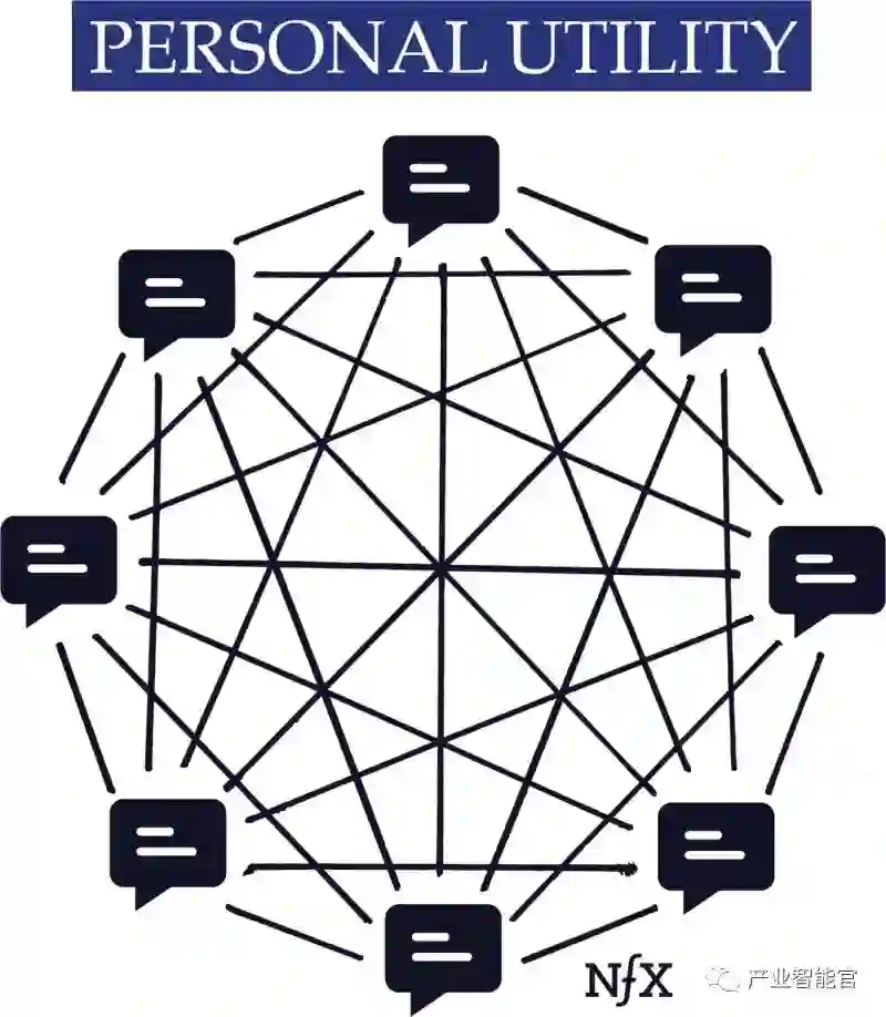 在上图中,节点代表的是个人效用服务(链接)连接的大家之间的聊天气泡(节点)。个人效用网络的节点跟使用者的真实身份是绑定在一起的,这种网络尤其密集因为有很多的局部子群。这样就使得Reed定律发挥作用了,所以个人效用网络的价值增长率也是2^N。