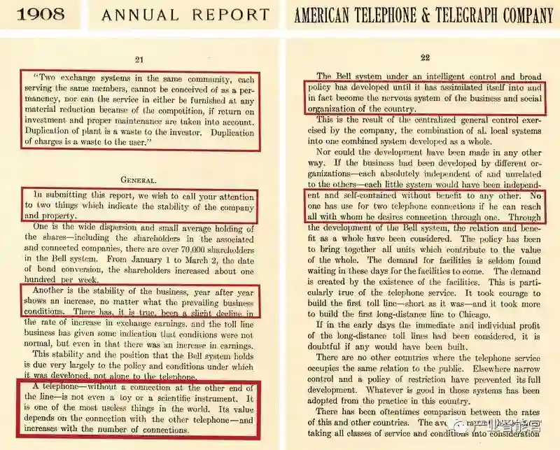 下面就是1908年那份年度报告的相关页面。你会注意到Vail没用过“网络效应”这个词,尽管概念是他描述的。网络效应这个词是后面才出现的。