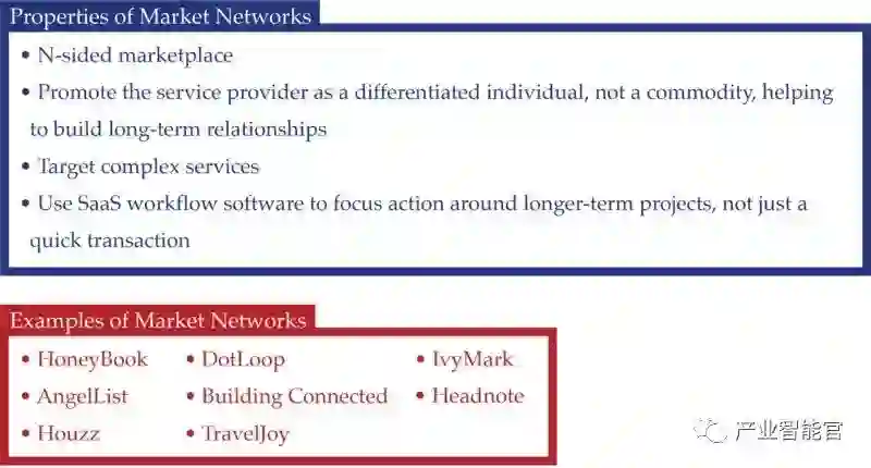 市场网络跟双边市场有很大的不同,尽管两者往往会混淆在一起。大多数人认为像HoneyBook和Houzz这样的公司属于市场,但其实不是。在现实中,它们属于市场网络,结合了个人网络与双边市场的主要元素,同时属于多边而不是双边——往往额外增加了专门的SaaS工作流软件。