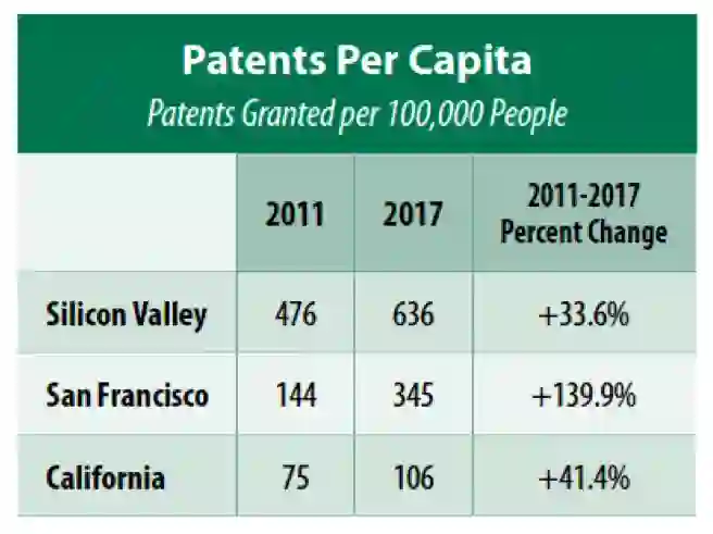 根据硅谷著名智库 Silicon Valley Joint Venture数据,2017年,硅谷(包含旧金山)的专利申请数占了全加州的53.7%, 全美的14.9%。此外,在过去的20年中,硅谷的人均专利注册数也呈大幅上升的趋势。