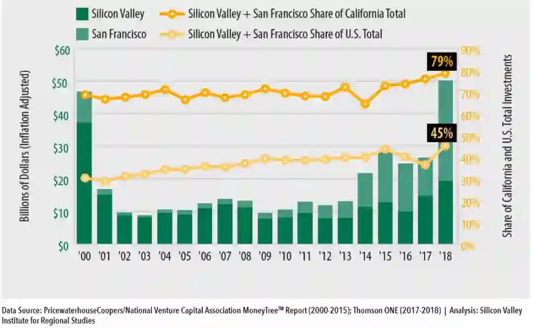 专利的蓬勃代表着科技创新的兴盛。紧跟着科技创新而来的,是资本。2018年硅谷初创企业获得的风险投资额占整个加州的风险投资额度的79%,占全美的45%。