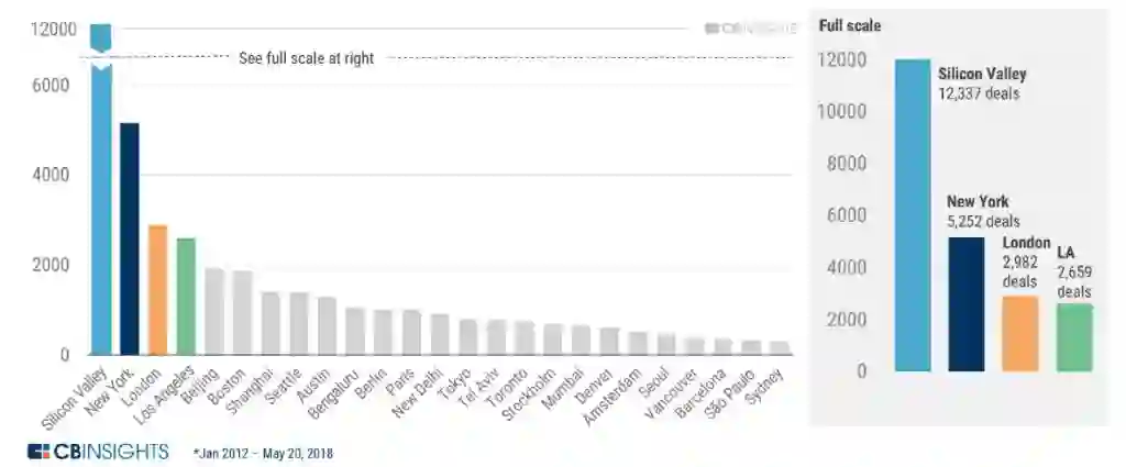 硅谷可以说是全球顶级风险投资机构的第一战线。根据CB Insights的数据,自从2012年来,硅谷的科技类风险投资交易数量达到1.2万笔,涵盖7000多个公司。其科技类风险投资交易数量超过了美国所有其他大都市地区的总和。