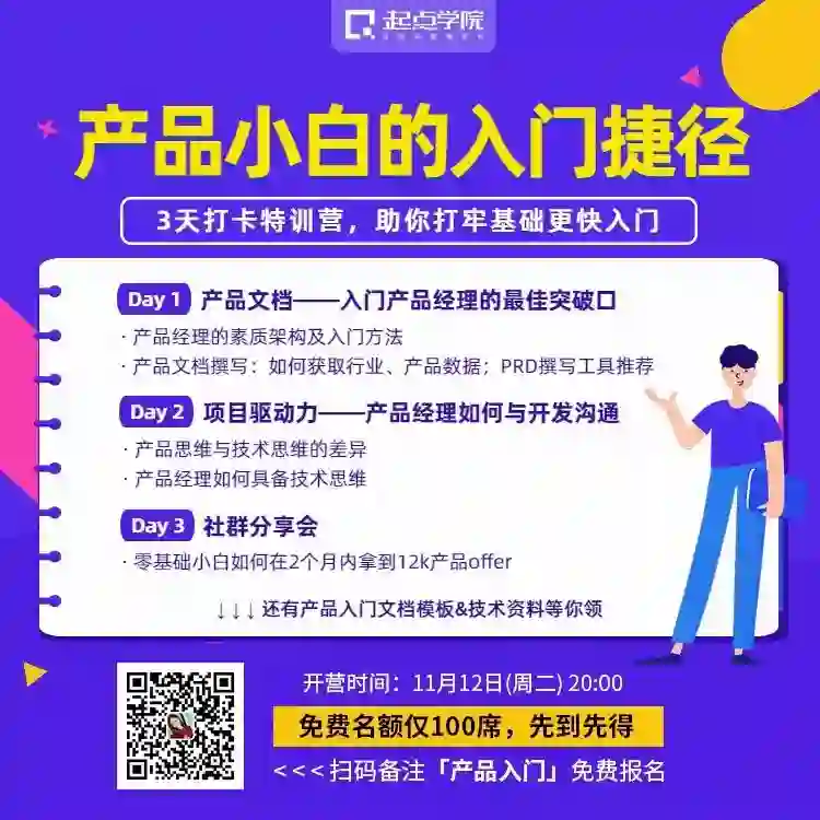 为了帮助产品小白更高效入门,起点学院与惠买集团产品总监@陈滨淋、前京东高级产品经理@唐韧,联合发起《产品小白的入门捷径》体验营。
