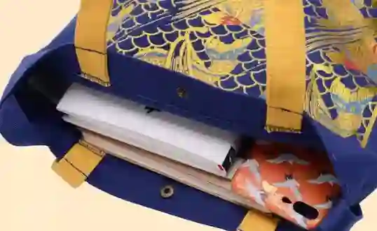 故宫文创·祥瑞主题帆布袋创意同样来源于故宫博物院藏品——杏黄色地松鹤纹织金锦和印彩鲤鱼海水纹布。它以优质16安帆布材质制作,手感柔韧结实。