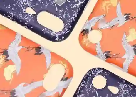 故宫文创·祥瑞主题手机壳创意来源分别是故宫博物院藏品——杏黄色地松鹤纹织金锦和印彩鲤鱼海水纹布。
