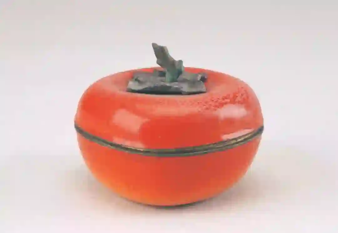 专门模拟柿子形态的藏品也有不少,如画珐琅红色光素柿形盒,釉色模仿深浅渐变,圆胖饱满。