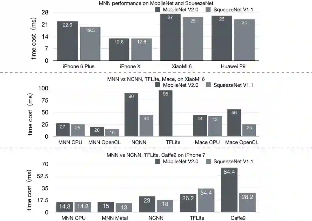 采用业务常用的 MobileNet、SqueezeNet 和主流开源框架进行比较,结果如下图: