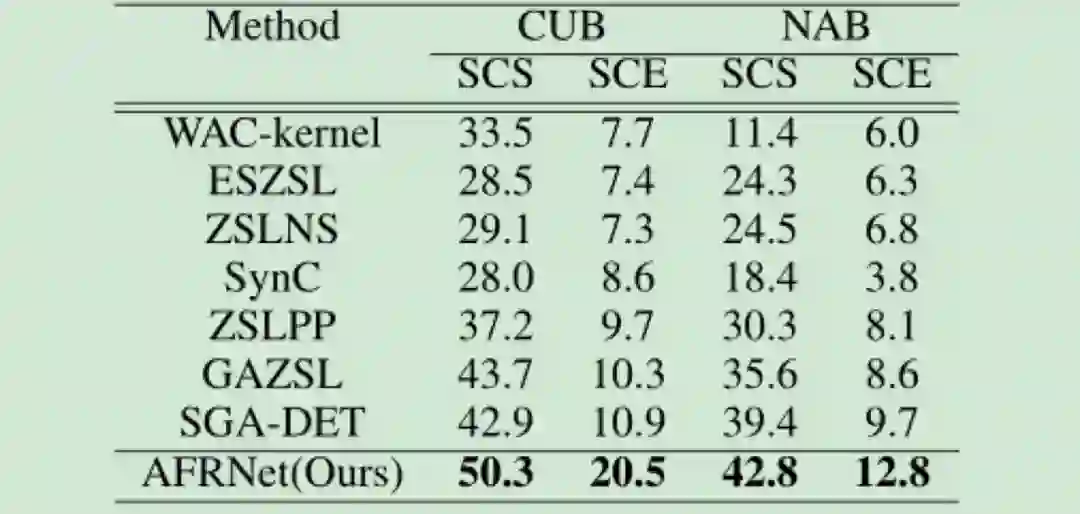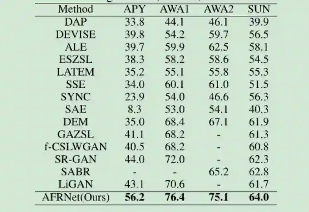 (APY,AWA1,AWA2,SUN)和2个细粒度的数据集(CUB,NAB)。在4个粗粒度的数据集上,我们采用了1种数据划分方法对已见类别与未见类别进行划分。在2个粗粒度的数据集上,我们采用了2种难度不同的数据划分方法划分已见类别和未见类别。在零样本学习中,实验结果评价方法一般采用未见类别上的准确率。本文方法的实验结果与当前的最好的结果进行了比较,结果如表1-2所示。
