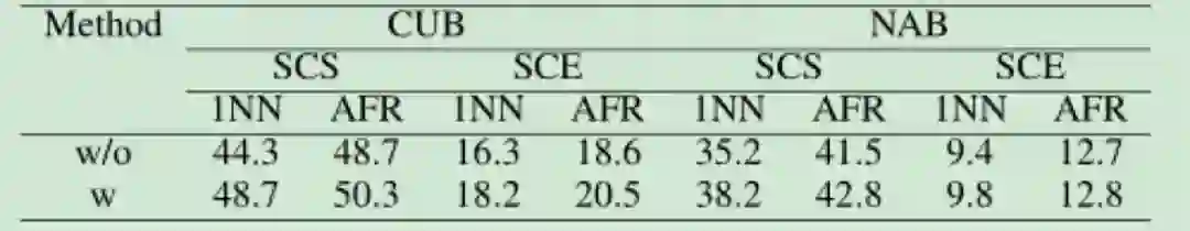在表4中,w/o表示没有采用基于预测损失的特征选择方法, w表示采用了基于预测损失的特征选择方法。表4的结果表明,通过选择预测损失较小的视觉特征维度代替整体的视觉特征,可以有效地增加视觉特征与语义特征之间的一致性。