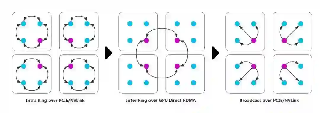 GDR技术加速Ring Allreduce:在前述方案的基础上,将GDR技术应用于跨节点Ring,这减少了主存和显存之间的Copy操作,同时为GPU执行规约计算提供了便利。