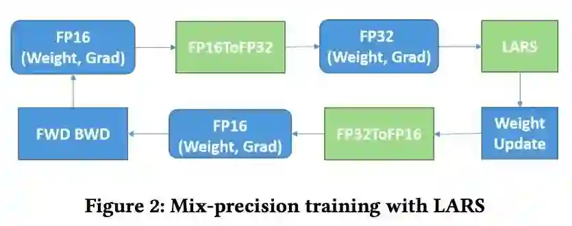 这两个成果非常互补,但它们不能直接结合使用,因为会导致梯度消失。为了融合两种思想,研究人员做出的改进是用LARS进行混合精确训练,如下图所示,当进行前向传播和反向传播时,系统先把参数和数据转成半精度浮点数,然后再做训练,而训练权重和梯度时,参数和数据则是单精度浮点数。