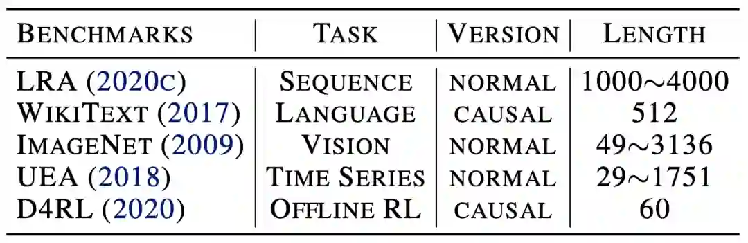 覆盖了长序列、视觉、自然语言、时间序列、强化学习五大任务;