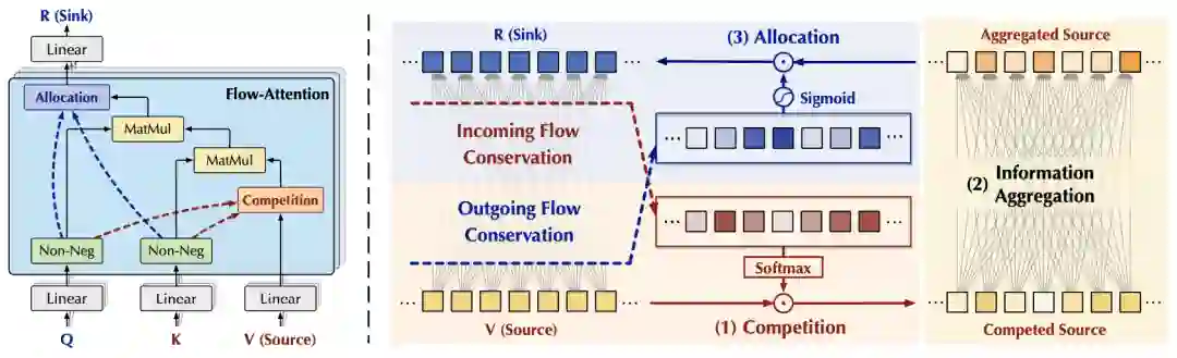 基于上述结果,我们设计如下Flow-Attention机制,具体包含竞争(Competition)、聚合(Aggregation)、分配(Allocation)三部分:
