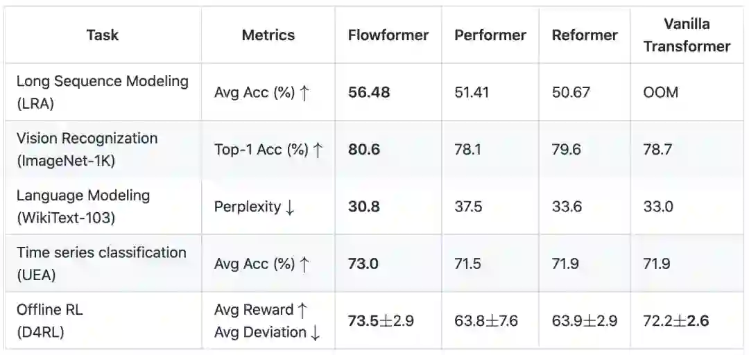 上述过程中的所有操作均为线性复杂度。同时,Flow-Attention的设计仅仅依赖于网络流中的守恒原理,对信息流的重新整合,因此并没有引入新的归纳偏好,保证了模型的通用性。将标准Transformer中的二次复杂度Attention替换为Flow-Attention,即得到了Flowformer。