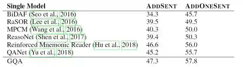 可以看到生成模型的效果要比效果最好的判别模型略差,但是本文的论点在于生成模型对question和context有更全面的理解,从而让模型有更好的泛化能力和应对对抗样本的能力。为了验证模型的泛化能力,本文作者构建了一个SQuAD的子集,该子集中训练样本中的context都只包含一个日期,数字或者人名类实体,但是在测试样本中有多个。如果模型在训练时仅依赖context中特殊类型的实体作为答案的数据特征,那么在测试集上就会表现很差。