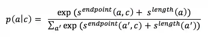 (1) 如果context是文档,例如SQuAD数据集,那么用ELMo得到context的表示后,该表示经过全连接层映射得到一个score(记为),该score在和候选answer的长度指标(),这两个score按如下公式得到每个候选answer的概率