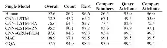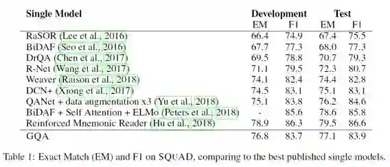 模型的实验结果如下所示,在SQuAD和CLEVR上都取得了仅次于当前state-of-the-art的判别式机器阅读模型的效果: