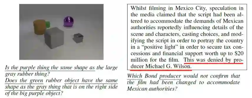 传统的机器阅读理解的模型都是给定 context 和 question, 找出最有可能回答该 question 的 answer,用概率表示为 p(a|q,c),这其实是一个判别模型。判别模型在大多数任务上可以取得比生成模型更好的准确率,但问题在于判别模型会利用一切能提升准确率的数据特征来做预测,这在机器阅读中会造成模型并未完全理解question和context,而是利用训练集中的一些数据漏洞来预测。如下图所示,模型只需要question中有下划线的词即可预测出正确答案,无须完全理解问题。在 SQuAD 中另一个典型的情况是:问题的疑问词是when或者who,而context中只有一个日期或者人名,这时模型只需要根据question的疑问词,context中的日期或人名即可回答问题,不用完全理解 question和context。